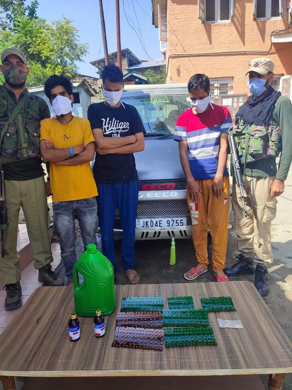 During naka checking at Dafpora Nasrullapora, police party of Police Station Budgam intercepted one vehicle bearing registration No.JK04E-9755 EECO Van with 03 persons onboard, during search of said vehicle, police party recovered 2.80 Grams of Heroin like substance, 5 Kgs of codeine based syrup in a plastic container, 02 Bottles of codeine based Syrup and 471 tablets of controlled medicine Alprazolam