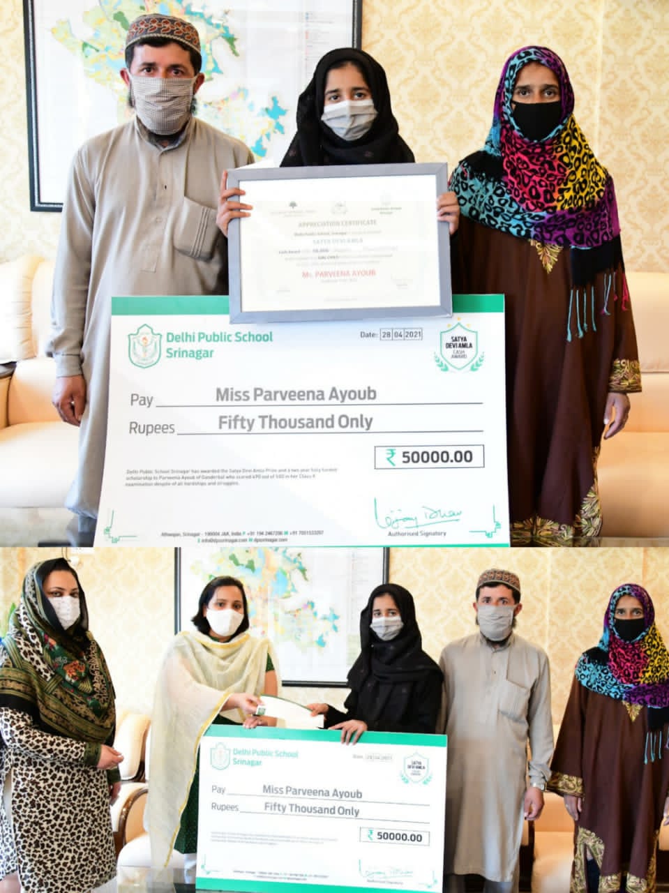 Ganderbal, April 28: The Deputy Commissioner (DC) Ganderbal, Krittika Jyotsna today handed over a cash prize of Rs 0.5 lakh and 'Satya Devi Amla' prize to Parveena Ayub, a 15 year old student who scured 490 marks out of 500 in 10th standard exams this year during a felicitation program organized by Delhi Public School at Mini Secretariat here.