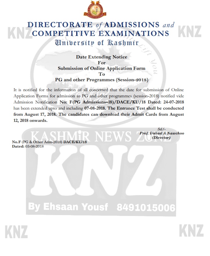 Application Forms for admission to PG and other programmes (session-2018) notified vide Admission Notification No: F(PG Admissions–18)/DACE/KU/18 Dated: 24-07-2018