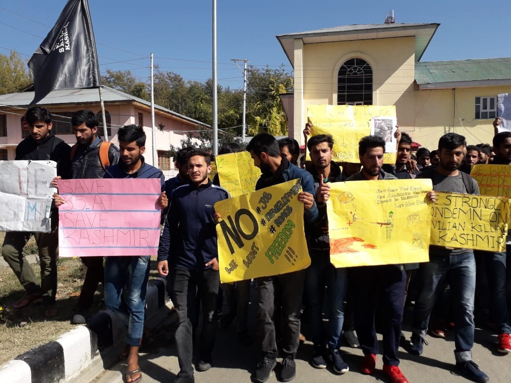 Sopore,October 22 : Scores of students of Sher-e-Kashmir University of Agricultural Sciences and Technology (SKUAST) of North campus at Wadoora Sopore on Monday staged a protest demonstration against the Kulgam Civilian killings.