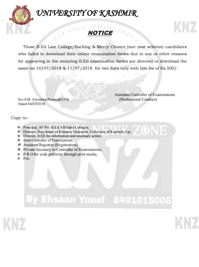 Notification regarding B.Ed Late College/Backlog& Mercy Chance (one year scheme) candidates who failed to download their online examination forms due to one or other reasons for appearing inthe ensuring B.Ed examination forms are directed to download the same on 10/07/2018 & 11/07/2018