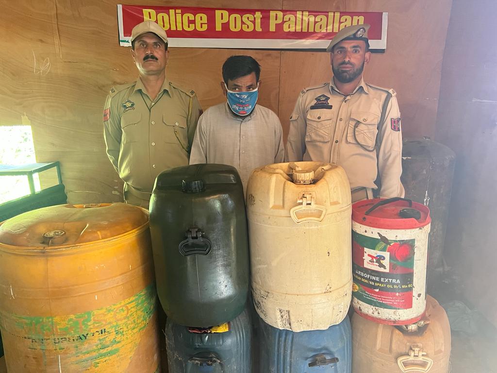 A police party under the supervision of SDPO Pattan Shri Mohd Nawaz-JKPS, assisted by Incharge Police Post Palhallan arrested a Shopkeeper identified as Mohd Yaqoob Sheikh son of Ghulam Hassan Sheikh resident of Tantraypora Palhallan who has been found involved in selling of Petroleum products illegal on exorbitant rates at his shop located at Palhallan Pattan, Baramulla. During search, 400 litres of Petrol/ Diesel was recovered from his shop. He has been shifted to PS where he remains in custody.