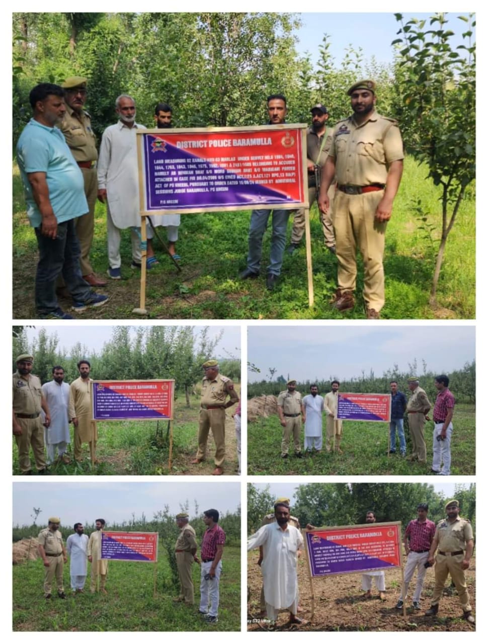 Srinagar, June 27 (KS):- Police in Baramulla after obtaining attachment order passed by Hon'ble Court Baramulla attached properties (9 Kanals) land worth crore belonging to 5 terror handlers based in Pakistan.