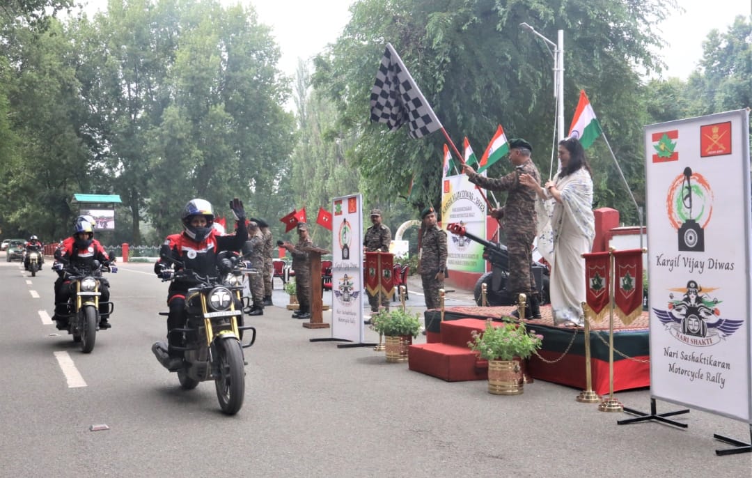 Srinagar, July 24 (KS): To commemorate 24 years of victory over Pakistan in Kargil War of 1999 and to showcase the indomitable spirit of women, the Armed Forces under the aegis of Headquarters Northern Command has launched the Nari Sashaktikaran Women Motorcycle Rally from National War Memorial, New Delhi to Kargil War Memorial, Dras on 18 Jul 23. The Rally reached Srinagar from Udhampur on 22 Jul 23 in the evening where it was received by Maj Gen PBS Lamba, GOC 31 Sub Area.