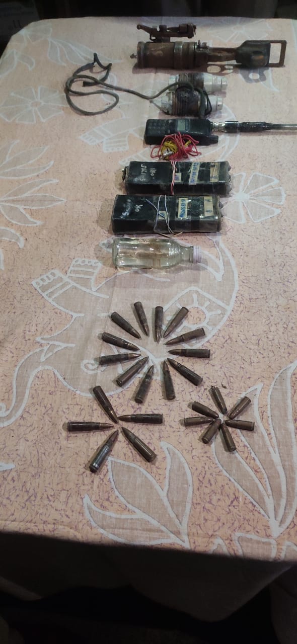 The ammunition recovered includes Rifle grenade-02, UBGL thrower-01, Wireless with antenna without battery -01, IED type with wire-02, Detonator type with wire-01, AK47 cartilage -17, 9mm cartilage -07, One glass bottle having glycerine type liquid-01, One khakhi jacket-01 and Black leather shoe-01.