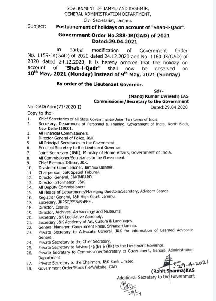 “In partial modification of Order No. 1159-JK(GAD) of 2020 dated 24.12.2020 and No. 1160-JK(GAD) of 2020 dated 24.12.2020, it is hereby ordered that the holiday on Government account of 'Shab-i-Qadr" shall now observed 10th May, 2021 (Monday) instead of 9th May, 2021 (Sunday),” reads an order issued here, a copy of which lies with GNS. (GNS)