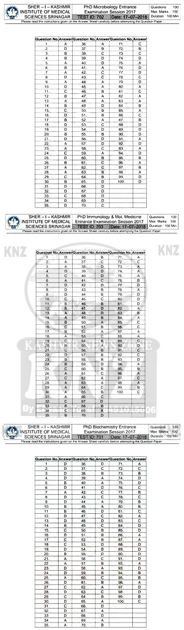 SKIMS: ANSWER Keys For PhD Entrance Examination Session 2017 Held on 17-07-2018.