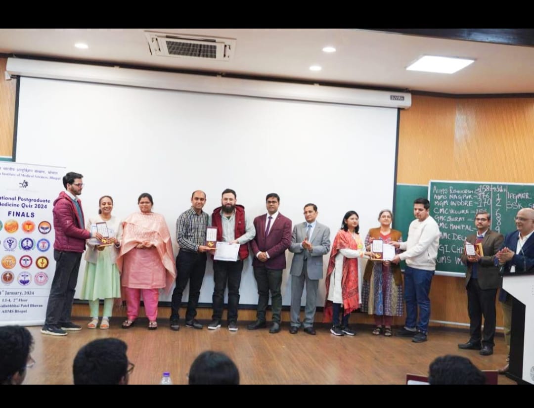 The team of final year postgraduates of Department of Medicine, SKIMS comprising Dr. Sheikh Mohsin,Dr Mir Tahleel and Uzair Hilal were selected after internal round of quiz competition by Medicine Academic Committee at SKIMS to represent SKIMS Medicine at AIIMS National Medicine Quiz 2024 organised and held by AIIMS Bhopal.