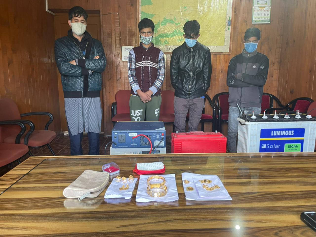 - Faizan Ahmad Dar S/O Nazir Ahmad Dar R/O Drusoo Rafiabad. 3. Safeer Ahmad Baba S/O Ghulam Ahmad Baba R/O Marazigund Rafiabad and 4. Irshad Ahmad Pandith S/O Abdul Rashid Pandith R/O Braripora Handwara confessed involvement in the commission of crime. Golden ornaments worth lakhs, 02 inverters and 02 batteries were also recovered from their possession. Investigation of the case is still going on, more recoveries are to be expected.