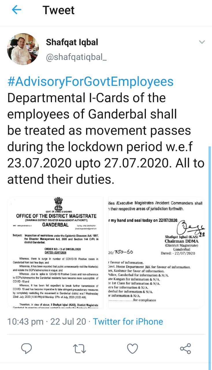 SSP Ganderbal, Khalil A. Poswal has urged people to stay home and strictly abide by the lockdown orders, as very strict lockdown and restrictions have been imposed in the district till 27th of this month.