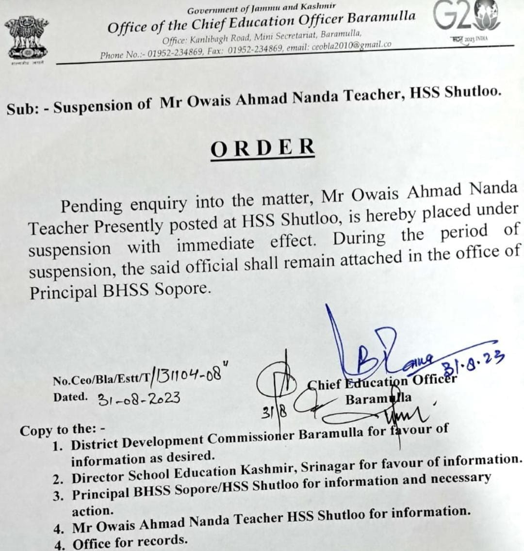 Rafiabad, 08 Sep: In a shocking development, a teacher at Hr Sec School Shutloo village in Rafiabad has been suspended pending an inquiry into allegations of engaging in indecent and sexually explicit chats with his female students.