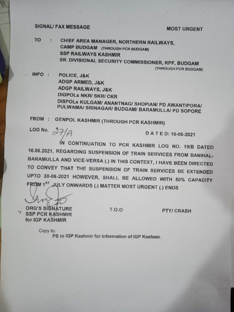 Srinagar, June 23 (GNS): Authorities on Wednesday extended till June 30 the suspension of train services from Banihal to Baramulla and vice versa in Kashmir Valley. However, from July 1 onwards, train services from Banihal-Baramulla and vice versa shall be allowed with 50% capacity.